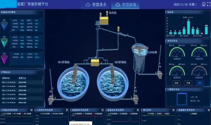 根據(jù)煤泥水處理情況,自動控制加藥機(jī)制藥,并根據(jù)濃縮池監(jiān)測情況(入料流量、入料濃度、清水層深度、溢流濁度、底流濃度)控制加藥機(jī)向濃縮池加藥的量,保障水處理效果。系統(tǒng)全自動控制,降低工人勞動強(qiáng)度,降低水處理藥耗。
