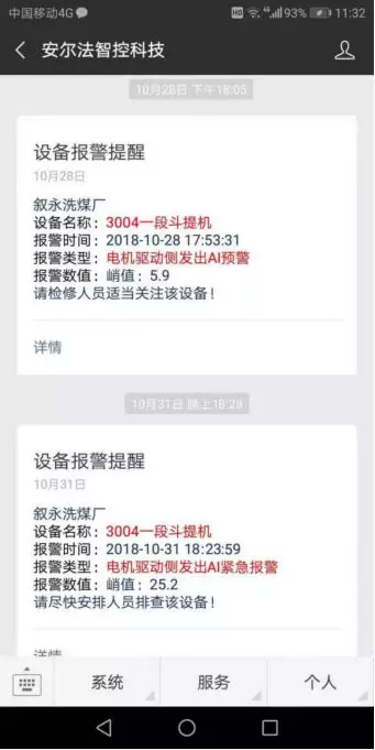 人機(jī)交互:所以,系統(tǒng)并在10月28日通過(guò)安爾法的微信端,持續(xù)推送預(yù)警提示,并給出專(zhuān)家意見(jiàn),提醒現(xiàn)場(chǎng)人員注意,建議進(jìn)行檢修。10月31日,由于振動(dòng)持續(xù)異常,根據(jù)歷史數(shù)據(jù)分析,系統(tǒng)預(yù)測(cè)設(shè)備劣化程度過(guò)高,可能會(huì)引發(fā)故障,系統(tǒng)開(kāi)始推送報(bào)警提示,要求相關(guān)人員及時(shí)進(jìn)行設(shè)備的檢修,避免設(shè)備長(zhǎng)時(shí)間帶病運(yùn)行造成設(shè)備損害,引發(fā)嚴(yán)重的故障停產(chǎn)事故。