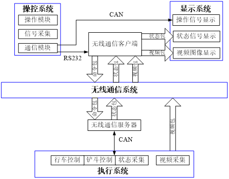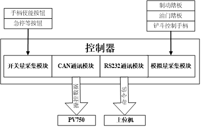 在該操控臺上搭建操控系統(tǒng)和監(jiān)控系統(tǒng)。通過操作臺上的手柄等操作機(jī)構(gòu)可以遠(yuǎn)程控制鏟運(yùn)車的行駛和動(dòng)作,操作員對操作臺上的各個(gè)旋鈕、按鈕以及手柄等進(jìn)行必要的操作,這種操作動(dòng)作經(jīng)控制器編譯后發(fā)送給上位機(jī),再通過無線網(wǎng)絡(luò)對鏟運(yùn)車的啟動(dòng)、變速、轉(zhuǎn)向、油門及剎車進(jìn)行遙控,使其按要求的速度和路線行駛,從而實(shí)現(xiàn)對鏟運(yùn)車的遠(yuǎn)程遙控和監(jiān)控。同時(shí),鏟運(yùn)車將前后路況的實(shí)時(shí)圖像和運(yùn)行參數(shù)視頻信號通過無線網(wǎng)絡(luò)實(shí)時(shí)傳輸?shù)桨惭b在操作臺上的上位機(jī)顯示屏上,使駕駛員可以實(shí)時(shí)遠(yuǎn)程掌握鏟運(yùn)車的真實(shí)駕駛環(huán)境,從而監(jiān)控鏟運(yùn)車的運(yùn)行情況,這樣,鏟運(yùn)車、遙控駕駛員以及遙控操控臺(遙控操縱平臺、無線路由、攝像機(jī)、控制系統(tǒng)等)就構(gòu)成一個(gè)閉環(huán)控制系統(tǒng)。