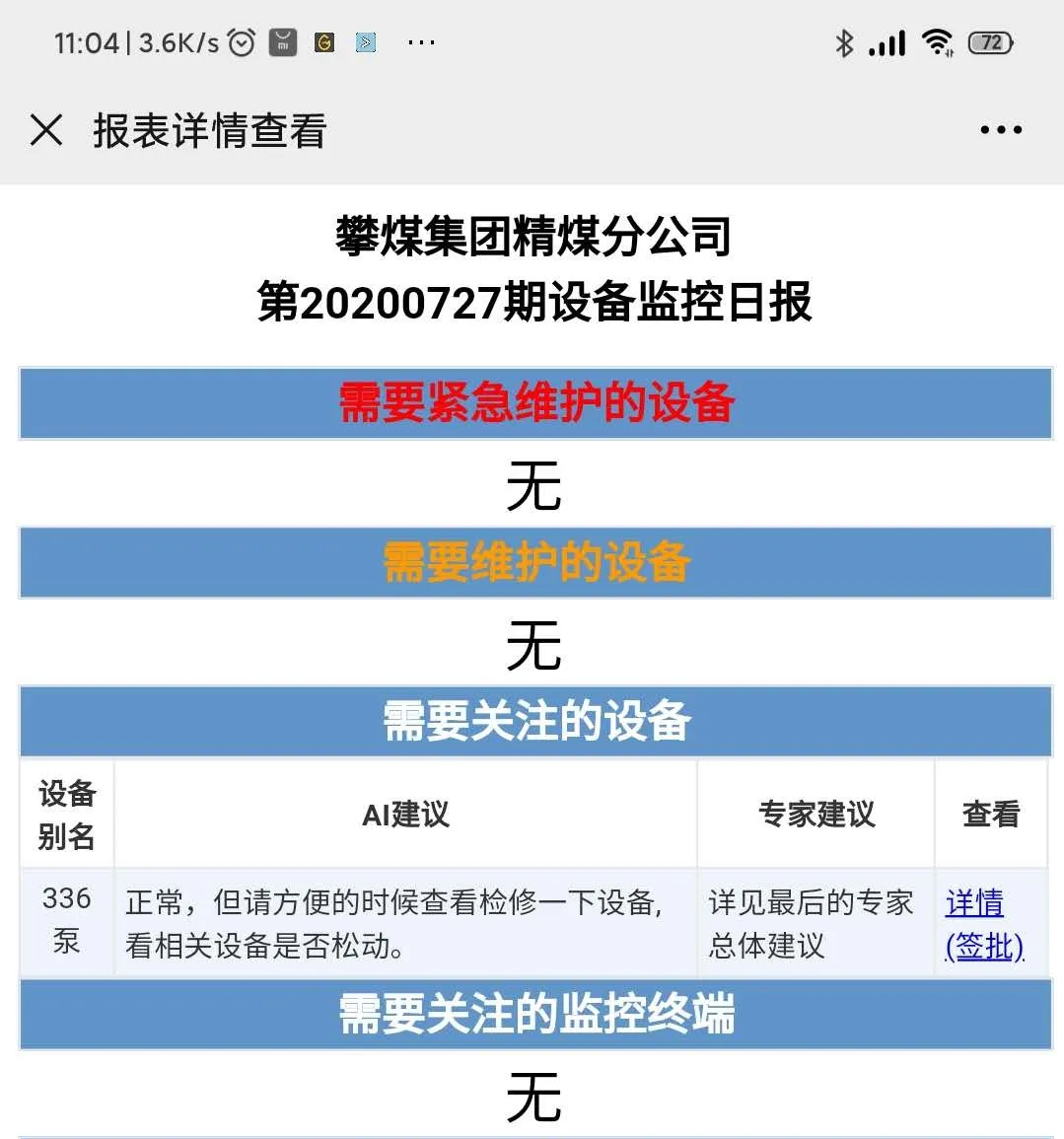 7月28日清晨,PdM系統(tǒng)后臺(tái)自動(dòng)生成了昨日的運(yùn)轉(zhuǎn)維護(hù)報(bào)告,報(bào)告中給出了AI建議并通過微信公眾號(hào)推送。