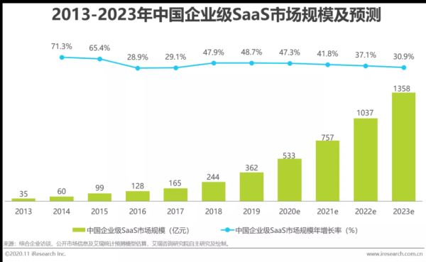 再說(shuō)回我們國(guó)內(nèi)市場(chǎng),根據(jù)艾瑞咨詢《2020年中國(guó)企業(yè)級(jí)SaaS行業(yè)發(fā)展報(bào)告》,2019年中國(guó)企業(yè)級(jí)SaaS市場(chǎng)規(guī)模相較2018年增長(zhǎng)了48.7%。預(yù)計(jì)在2022年,中國(guó)企業(yè)級(jí)SaaS市場(chǎng)的規(guī)模將突破千億元。雖說(shuō)銀行業(yè)仍然是當(dāng)今中國(guó)最賺錢的行業(yè),但是目前中國(guó)的計(jì)算機(jī)行業(yè)年利潤(rùn)處于相對(duì)較低的水平,大概110億元,這說(shuō)明國(guó)內(nèi)的SaaS服務(wù)模式有著巨大的發(fā)展?jié)摿涂臻g,中國(guó)有64.5%的SaaS用戶企業(yè)聚集在金融、教育、制造業(yè)、建筑地產(chǎn)、軟件開發(fā)等細(xì)分行業(yè),而SaaS服務(wù)模式的數(shù)字化發(fā)展也是未來(lái)的大勢(shì)所趨。