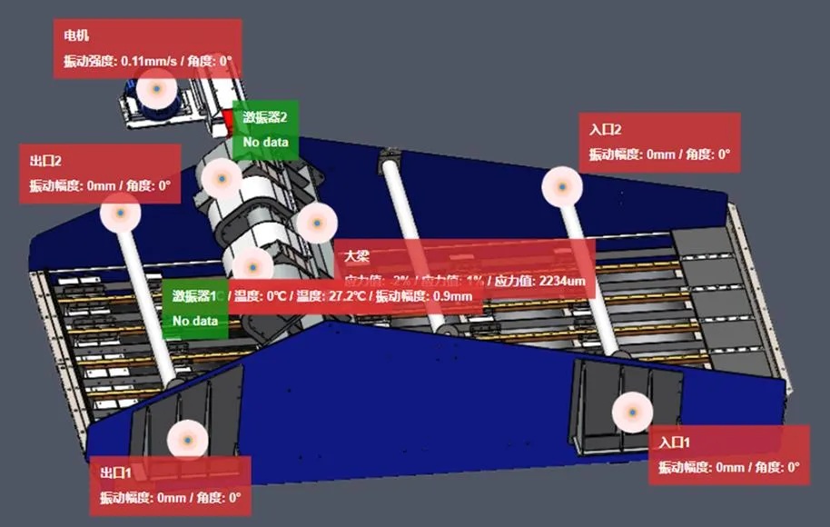 查看監(jiān)測功能:顯示設(shè)備監(jiān)測的點(diǎn)位,以及監(jiān)測部位的運(yùn)行狀態(tài),點(diǎn)擊監(jiān)測點(diǎn),能夠定位并重點(diǎn)展示監(jiān)測點(diǎn)的具體位置, 并將該監(jiān)測設(shè)備的單點(diǎn)詳細(xì)信息展示出來,比如溫度和振動數(shù)值等,能夠快速返回查看整體設(shè)備情況